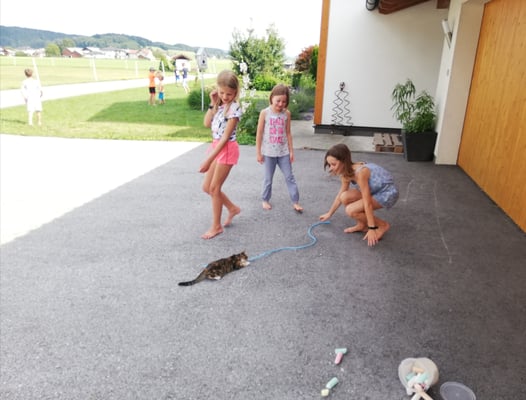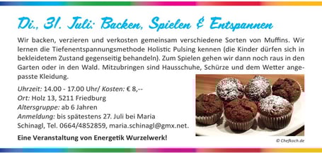 Wie bereits letztes Jahr durften viele Kinder in den Ferien ein paar lustige Stunden bei mir verbringen... Gemeinsam haben wir Muffins gebacken und verziert, die Kinder haben die Tiefenentspannungsmethode Holistic Pulsing kennenlernen und haben meinen Parkplatz mit Straßenmalkreiden verschönert.