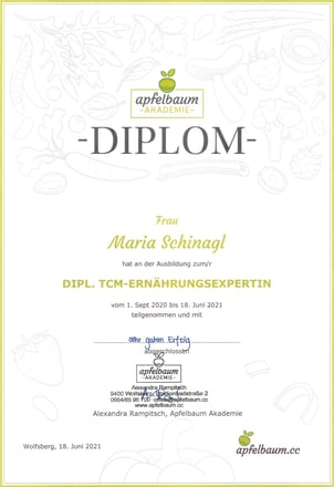 Letztes Jahr habe ich das Diplom für die TCM Ernährungsexpertin bei Alexandra Rampitsch von Ernährungsberatung Apfelbaum gemacht und jetzt gerade mache ich die Fortbildung zur TCM Ernährungsexpertin für Frauen und Kinder.