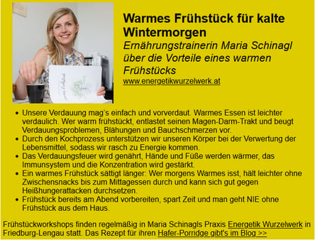 Die Firma Farmgoodies hat im Jänner Newsletter das Thema warmes Frühstück aufgegriffen und zwei Rezepte von mir am Blog veröffentlicht.